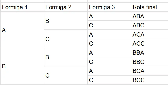 Chamando os lados do triângulos de A, B e C. A formiga 1 pode escolher entre A e B, A formiga 2 pode escolher entre B e C, A formiga 3 pode escolher entre A e C. Cada formiga pode escolher dois caminho, portanto são 8 combinações possíveis (2^3). Somente as escolhas A-B-C e C-B-A …