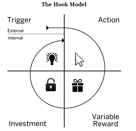 Um comportamento gera um gatilho (estou entediado) -> o usuário faz alguma coisa (verificar facebook) -> isto gera uma recompensa (vê status dos amigos) -> isto faz com que o usuário ou gaste mais tempo ou dinheiro para manter esse ciclo girando e antecipando recompensas futuras.
