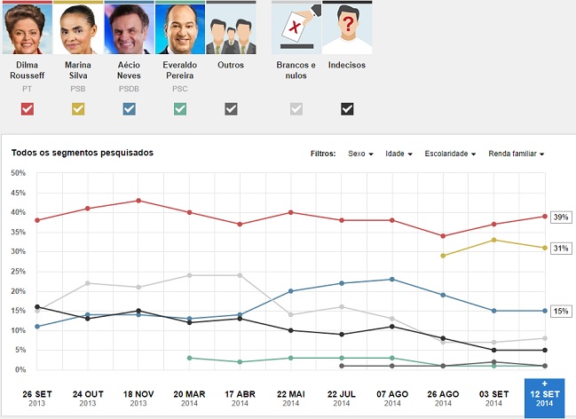 As pesquisas mostram Dilma com 39%, Marina com 31% e Aécio com 15%.
