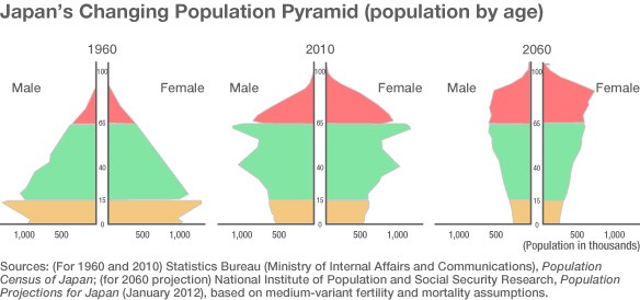 Ao longo dos anos, a industrialização permitiu ao Japão aumentar a expectativa de vida. Também ocorreu uma diminuição da taxa de natalidade, característica comum a todos os países urbanos. A pirâmide foi ficando mais comprida e estreita.