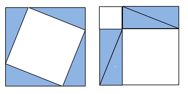 No segundo desenho, o quadrado branco pequeno tem área a^2, e o quadrado maior em área b^2.