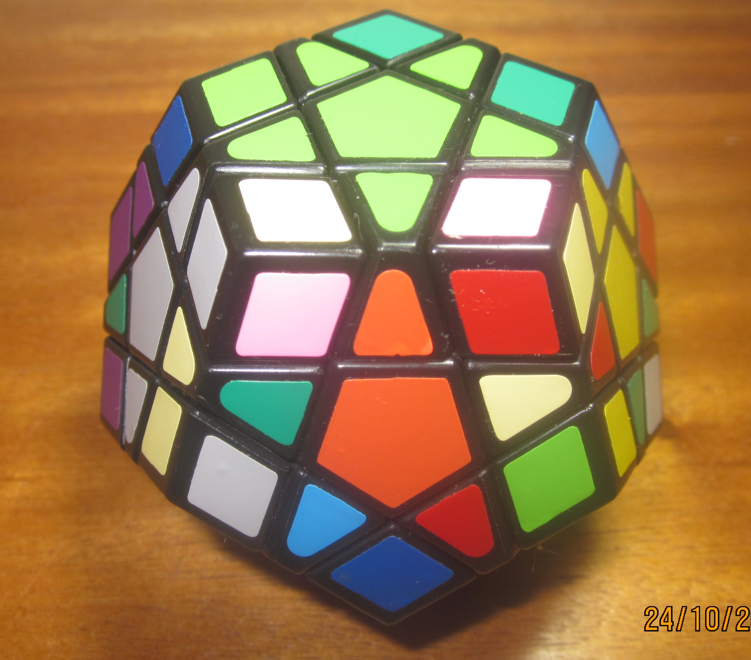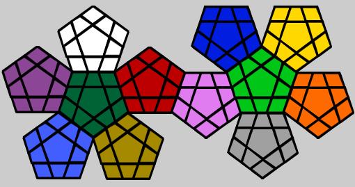 Este algoritmo canto base, ou a sua versão espelhada, aplicado nas 5 peças de canto, é suficiente para resolver a primeira face do dodecaedro, a base. O resultado é algo assim.
