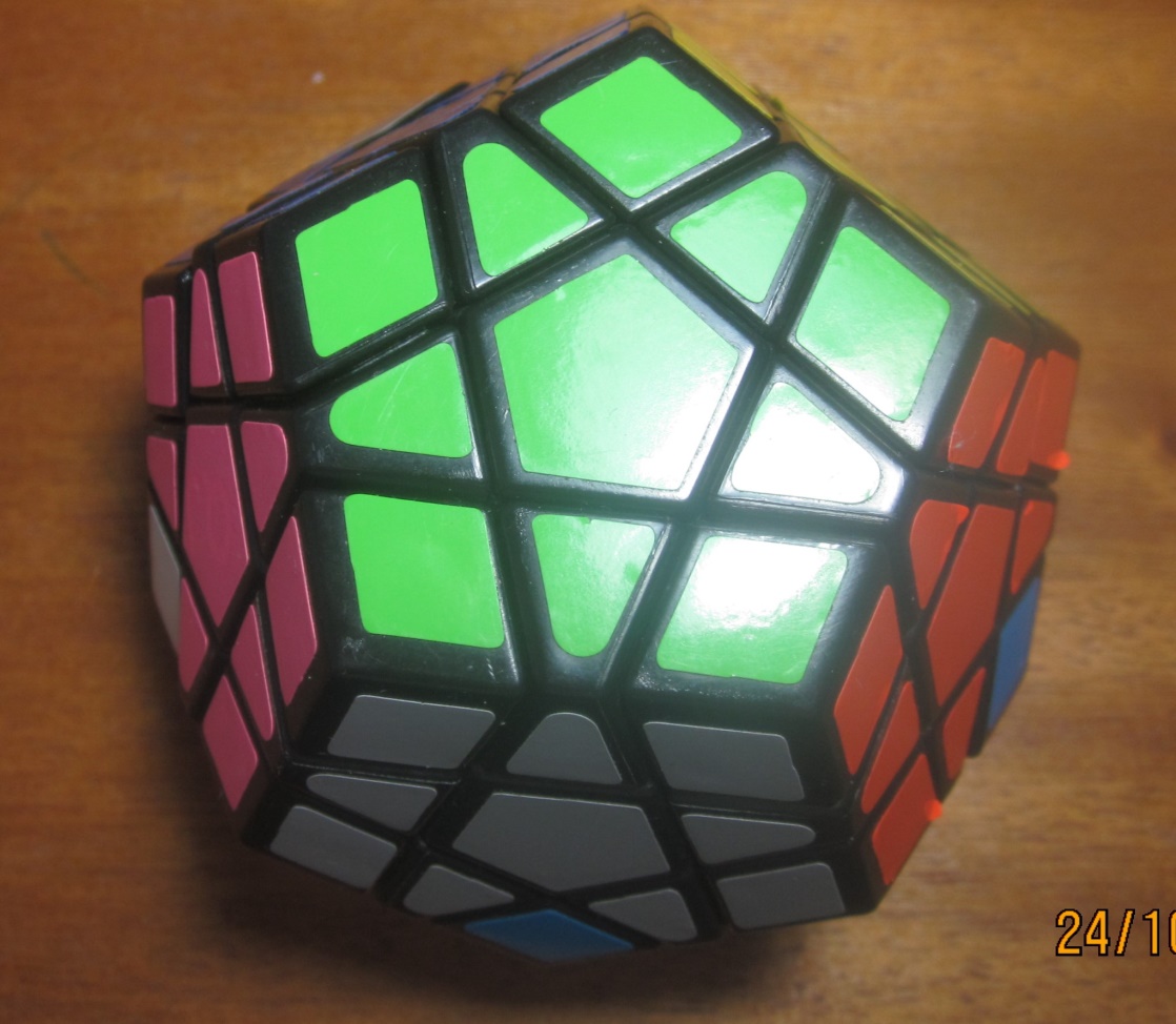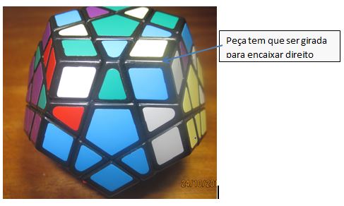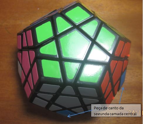 Virando o dodecaedro de cabeça para baixo, ainda tem uma camada de peças laterais. Deve-se arrumar as laterais de novo com o algoritmo lateral.
