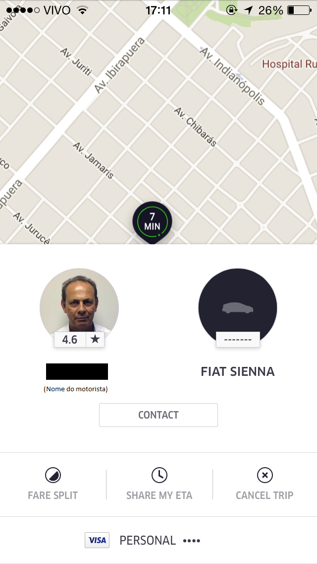 3. Peço para chamar o motorista. O Uber faz o chamado, e o motorista que aceitar a corrida aparece no seu aplicativo. No caso, era o senhor da foto. Aparece também a avaliação do motorista e o carro, e o tempo de chegada. Há a opção de ligar para motorista, caso necessário. Também pode-se cancelar a viagem.