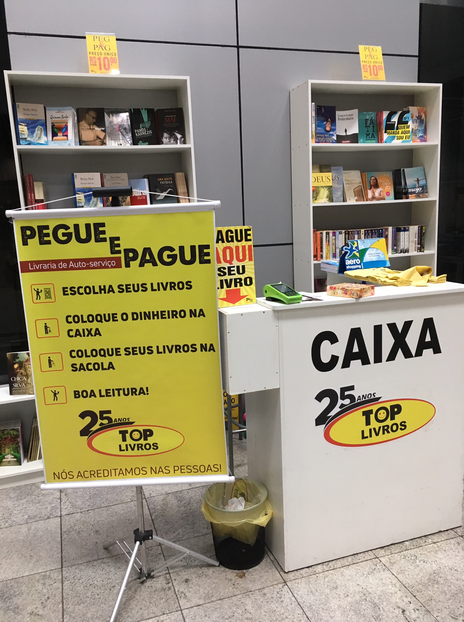 Este modelo é totalmente baseado em confiança. Mas note que fica dentro do aeroporto, e com um produto (livros populares) que a cada dia perde valor agregado.
