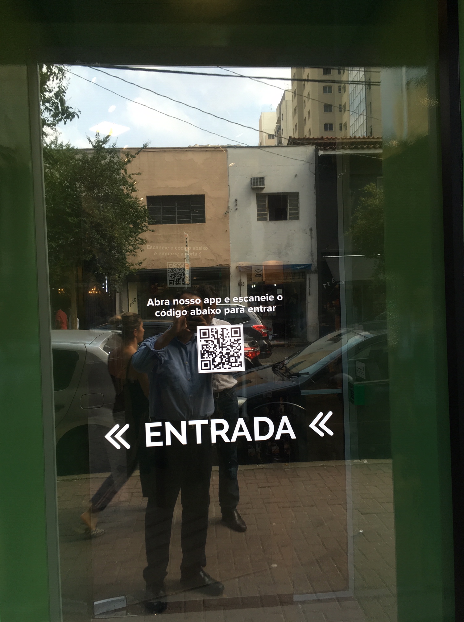 Em frente à loja, escanear o QR code com o aplicativo para a porta abrir.