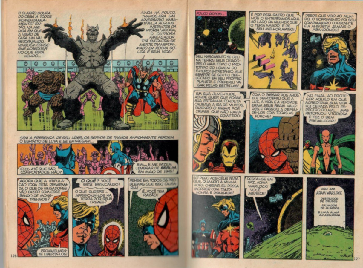 Desta vez, o Capitão Marvel foi coadjuvante, e Adam Warlock o personagem principal pela derrota do titã louco. Warlock pagou com a própria vida, levando junto Thanos… ou era o que se pensava, porque a história de Thanos é tão icônica que ressuscitaram ele, Warlock e outros na série de histórias do infinito, publicadas muito tempo depois, com roteiro de Jim Starlin também.