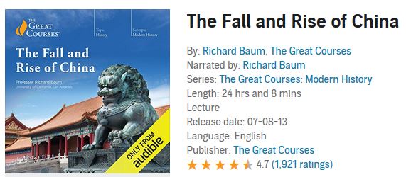 6) The fall and rise of China. Brilhante série de aulas, do prof. Richard Baum, sobre a história da China, desde os primórdios até os dias atuais. Permeia passado e presente, pontuando os principais pontos da história, como o Grande Salto para Frente, a Revolução Cultural. Também inclui relatos pessoais, como a sua visão quando ocorreu o incidente da Praça da Paz Celestial.
