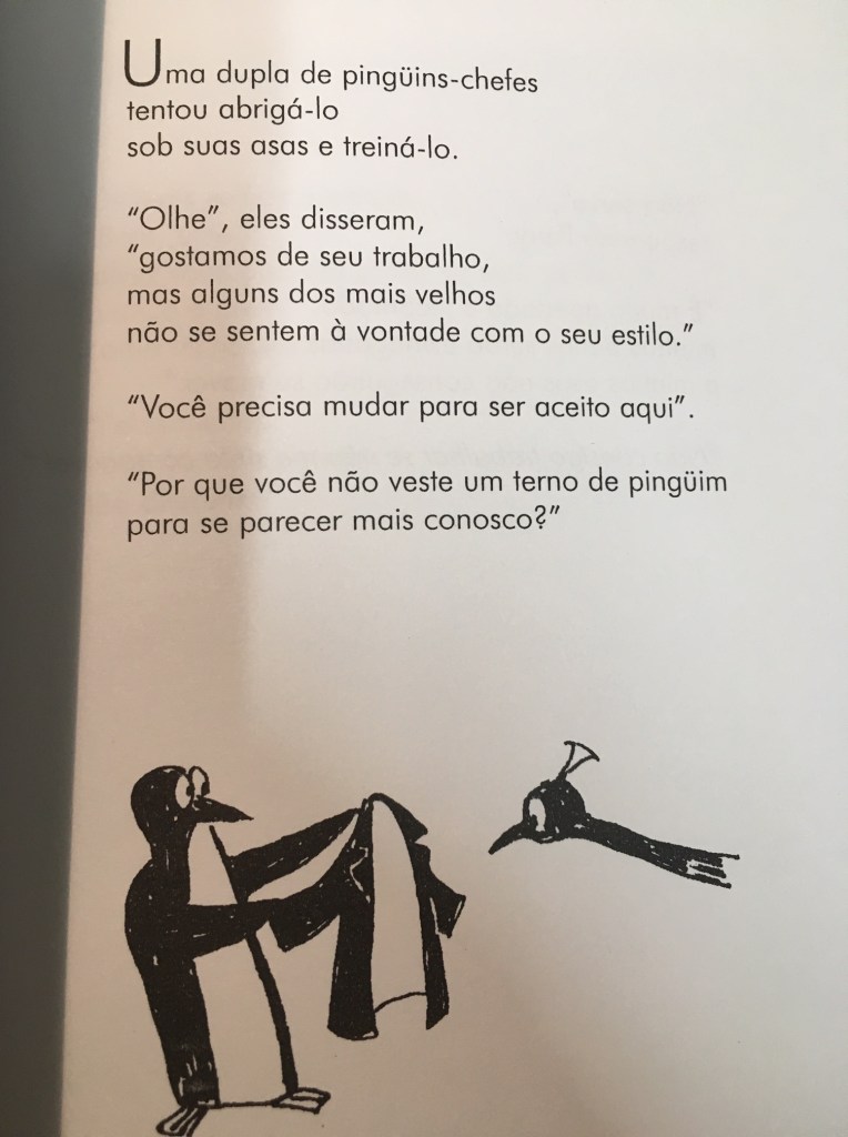 Vi num sebo o livrinho “Um pavão na terra de pinguins”. Não tive dúvidas, afinal, este foi uma recomendação do prof. Carlos Viveiro.