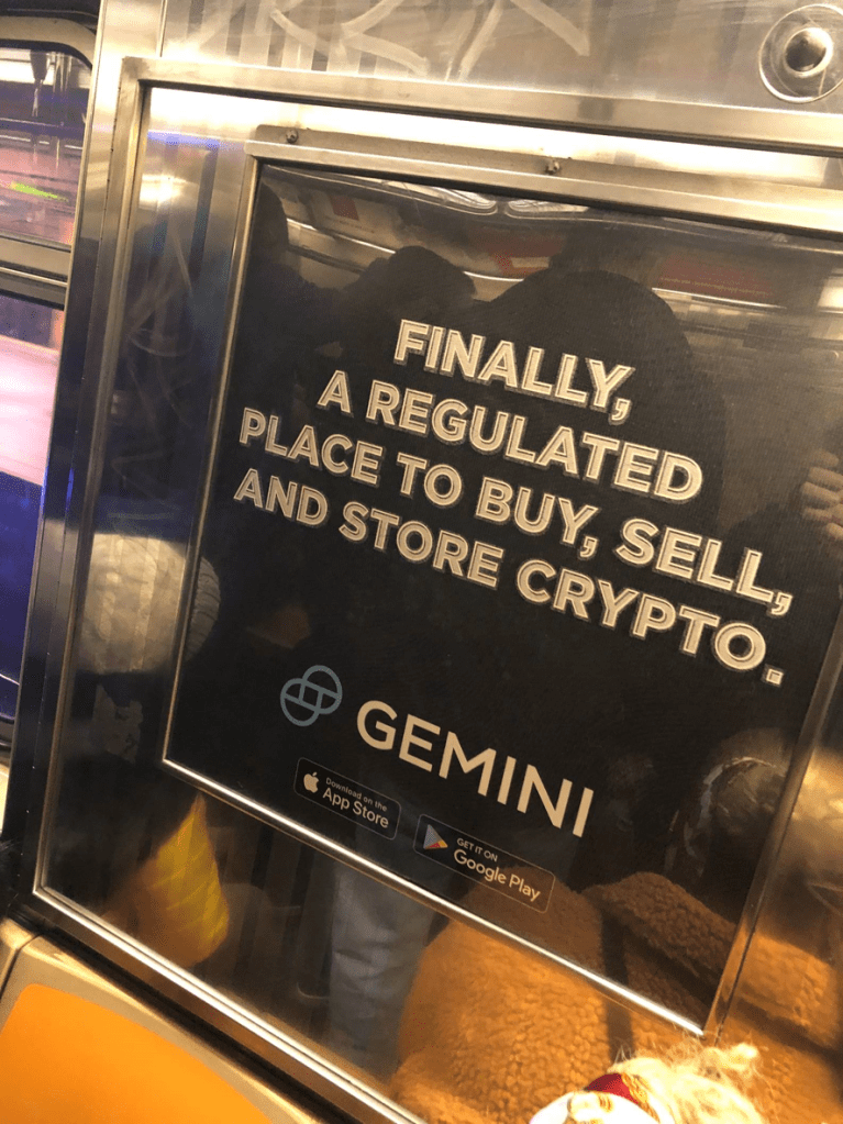 Quando estive no frio de Chicago, em Nov de 2019, vi um anúncio curioso no metrô: uma empresa chamada Gemini, convidando o cidadão comum a comprar e vender criptomoedas como o Bitcoin.
