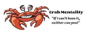 Coloque um monte de caranguejos num balde. Eles vão tentar escapar, escalando as paredes. Nisso, um caranguejo se engancha no outro, puxando para baixo o que está acima. No final, ninguém consegue sair do balde.