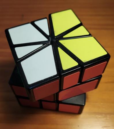 O cubo Square One (ou Square -1) é o da foto. Ele tem movimentos bem diferentes do Rubik tradicional – ou seja, deu para aproveitar pouco dos movimentos daquele.