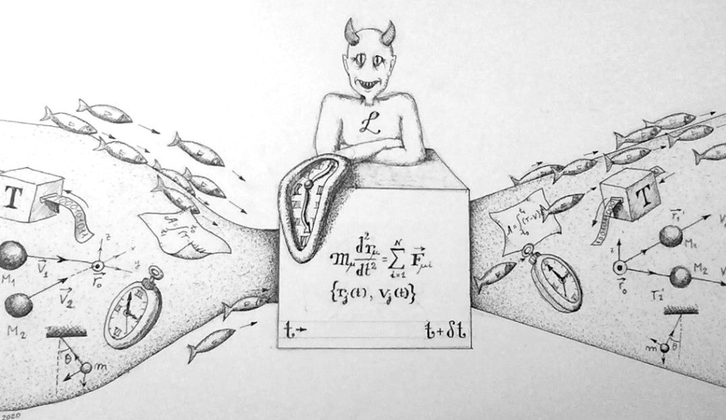 Isso levou o matemático Pierre de Laplace a pensar num “computador” ou “demônio de Laplace”. Se eu souber a posição e velocidade de todos os átomos do universo e jogar neste computador, poderei utilizar as leis de Newton para calcular a posição futura de tudo: todos os corpos do universo, todas as colisões, explosões e interações entre partículas.