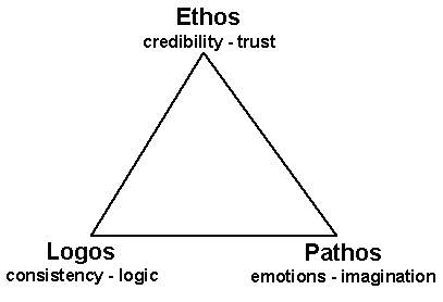 Ethos, Pathos e Logos: elementos da persuasão, segundo o grande Aristóteles. É a arte de escolher o melhor argumento a cada caso com o fim de persuadir.