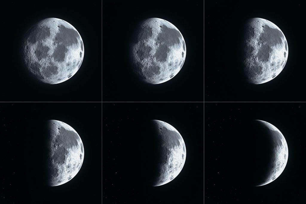 O segundo ciclo ocorre à noite: a Lua tem fases, e mais ou menos a cada 30 dias, as fases se repetem.