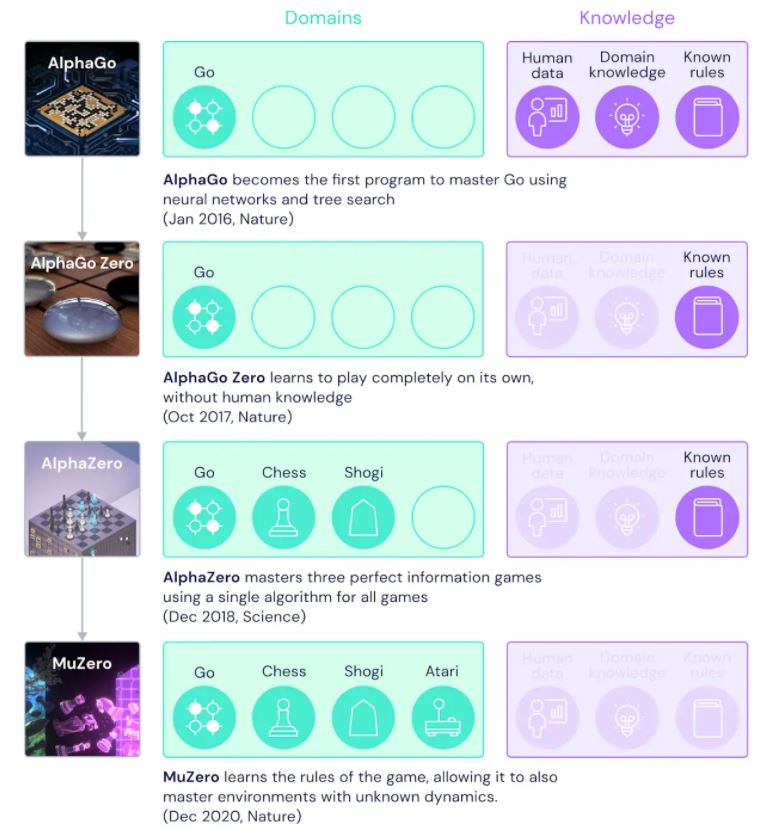 A última evolução da família é o MuZero, capaz de aprender a jogar Go, Xadrez, Shogi (um xadrez japonês) e Atari, com desempenho top level, e sem ter as regras explicitamente ensinadas.