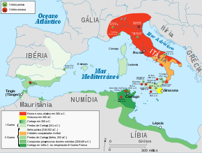 Cartago e Roma entraram em confronto, em ocasiões conhecidas como as Guerras Púnicas. Nesta, muito se fala do grande general cartaginense Aníbal Barca, que cruzou o Mediterrâneo e atravessou os Alpes, com um exército de homens e elefantes, e obteve vitórias humilhantes sobre os romanos.