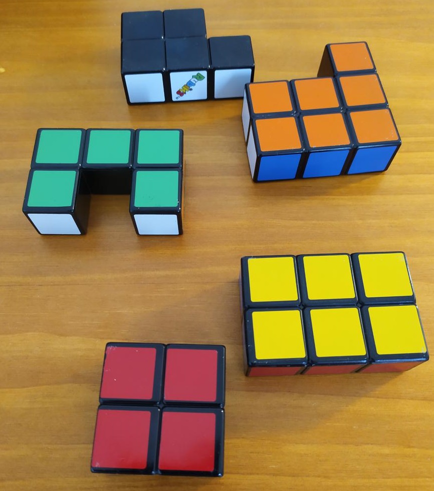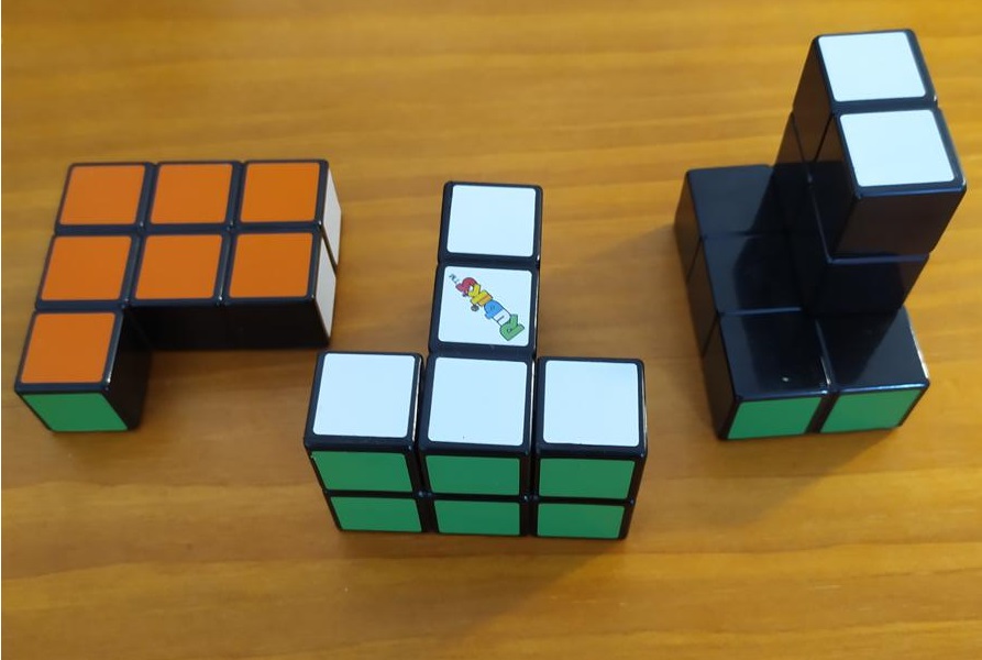 O da esquerda é uma espécie de “Tetris”. Um cubo decomposto em partes.