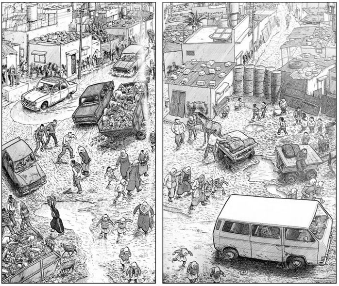 Na obra “Palestina”, ele entrevista e convive com famílias árabes na região do conflito. Diversas histórias extremamente tristes são narradas.
