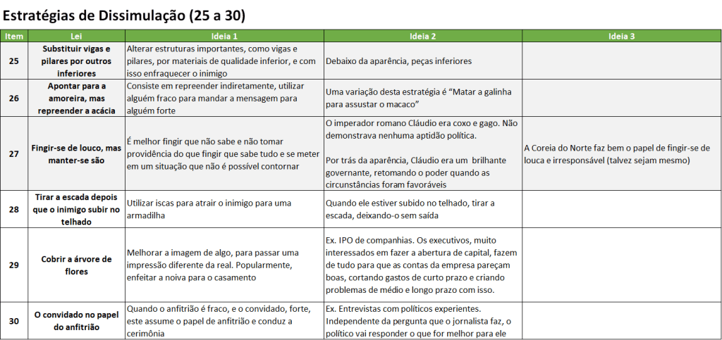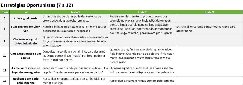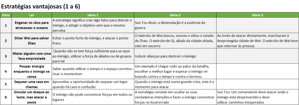 Coloquei as 36 estratégias de guerra chinesas no formato “cheat sheet”, ou “planilha bizurada”.
