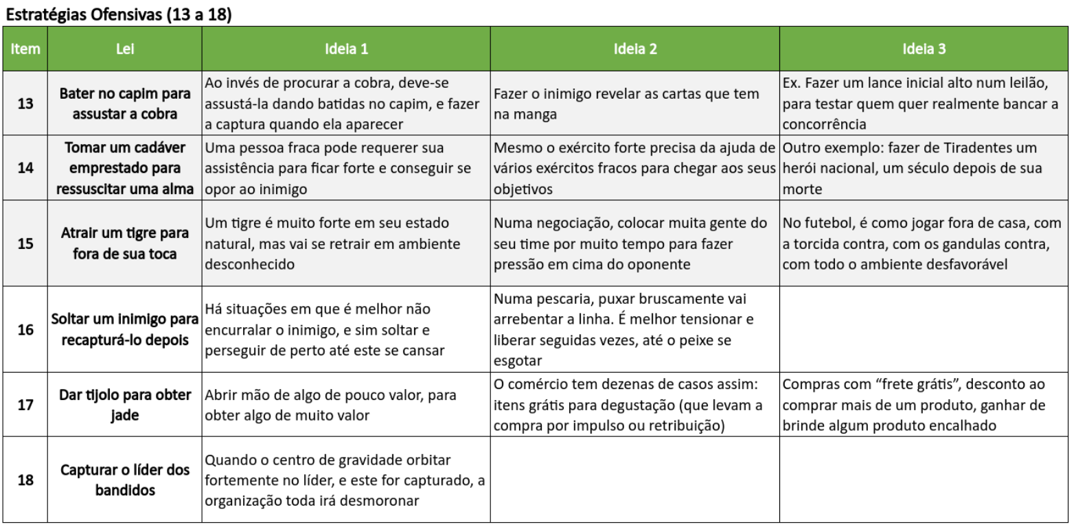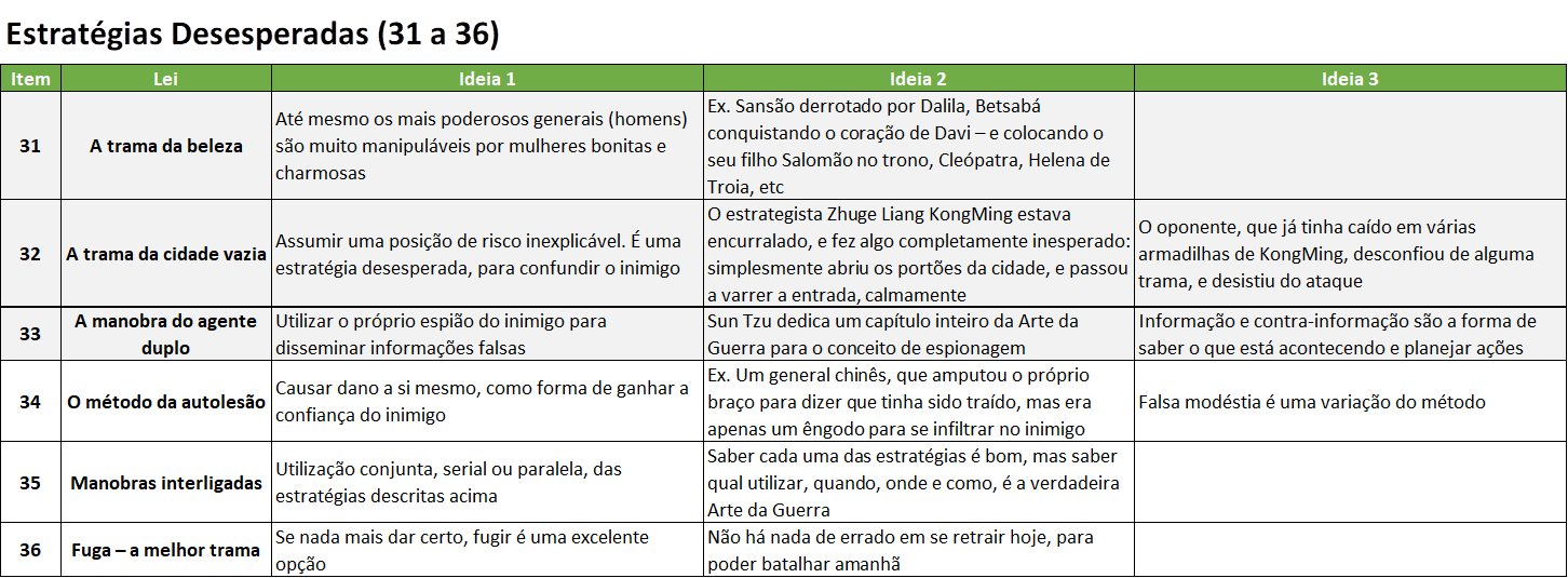 Coloquei as 36 estratégias de guerra chinesas no formato “cheat sheet”, ou “planilha bizurada”.