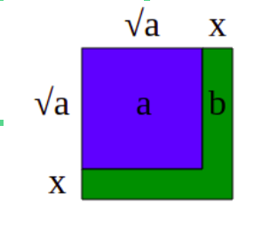 Se a área verde é igual a b, metade dela será b/2, e essa área é aproximadamente igual a raiz(a) * x, desprezando a “quina” que não faz parte do retângulo.