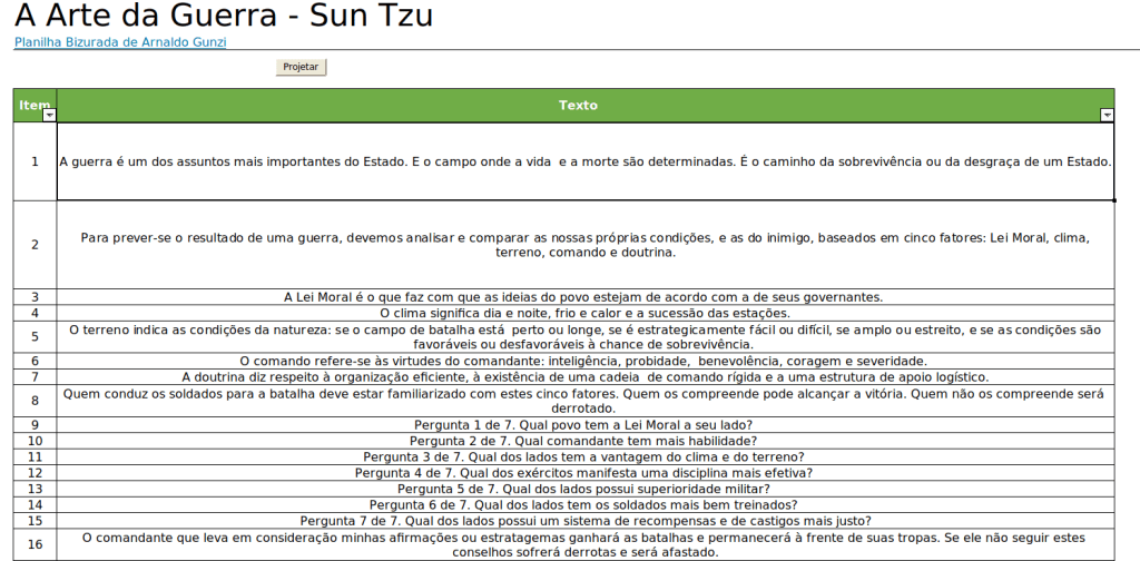 Segue, para download, um resumo da Arte da Guerra de Sun Tzu, no formato de “planilha bizurada” (cheat sheet).