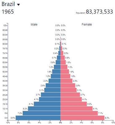 Vejamos o Brasil de 1965. Eram 83 milhões de habitantes, e uma típica pirâmide de idades.