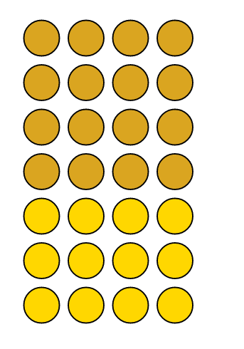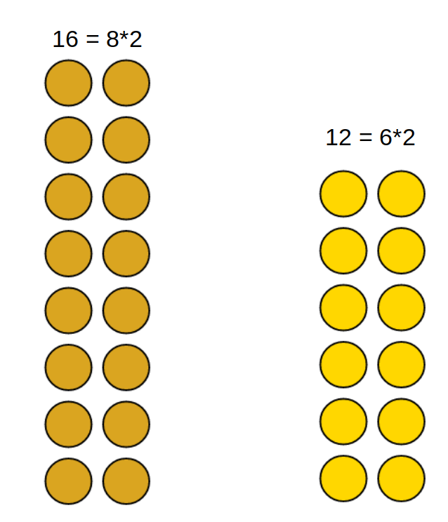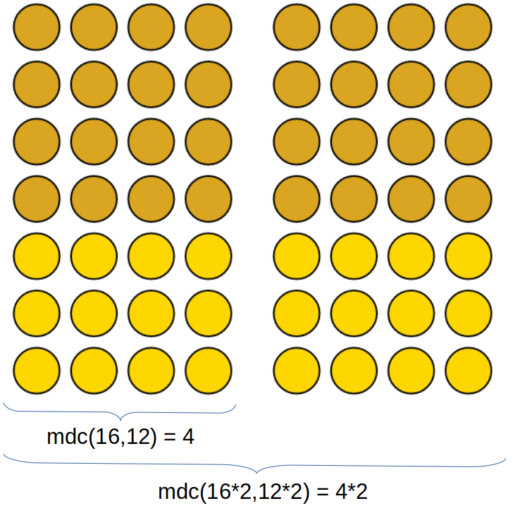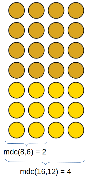 Exemplo visual. Sejam a = 16 e b = 12. O mdc será d = 4, pois é o máximo de colunas que a base da composição pode ter para dividir tanto as pedrinhas de a quanto de b.