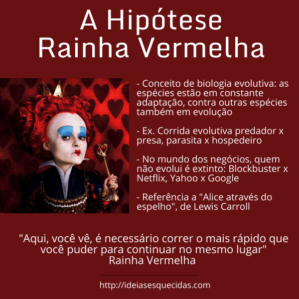 A hipótese da Rainha Vermelha é um conceito utilizado em biologia evolutiva, para indicar que as espécies devem estar em constante adaptação, para sobreviver contra outras espécies, também em constante evolução. A hipótese da Rainha Vermelha foi criada por Leight Van Valen, tomando como referência uma passagem de “Alice através do espelho”, de Lewis Carroll.