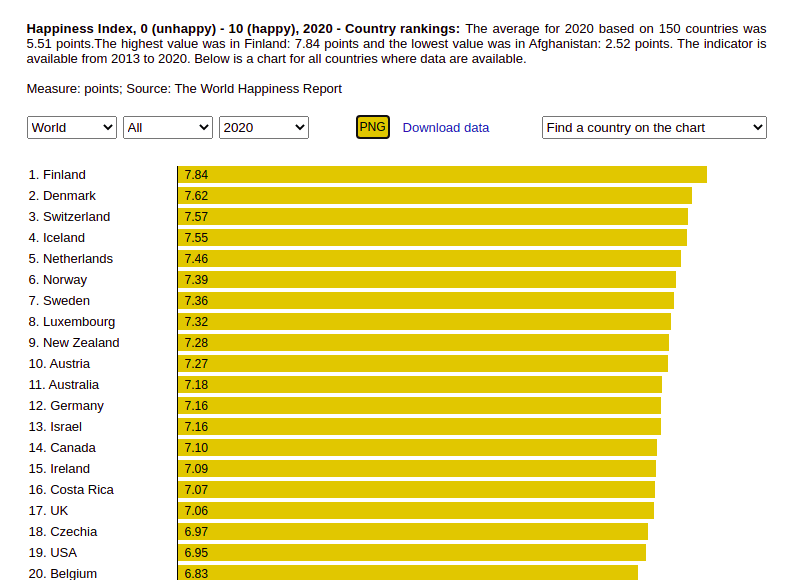 Segue o índice de 2020, onde o valor é medido numa escala de 0 (infeliz) a 10 (feliz). Fonte: https://worldpopulationreview.com/country-rankings/happiest-countries-in-the-world.
