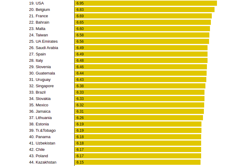 Segue o índice de 2020, onde o valor é medido numa escala de 0 (infeliz) a 10 (feliz). Fonte: https://worldpopulationreview.com/country-rankings/happiest-countries-in-the-world.