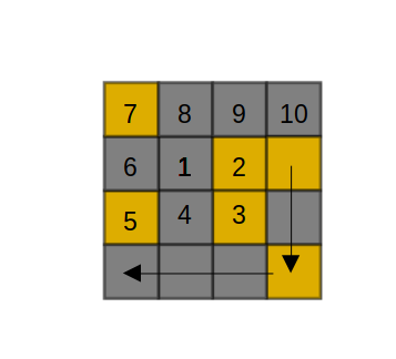 A espiral começa com o número 1, e depois vai preenchendo os demais números, seguindo um padrão espiral.