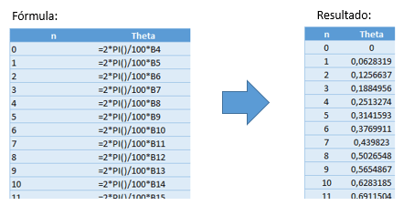 No Excel, primeiro vamos dividir um ângulo de 360 graus (ou 2*pi) em 100 pedacos.