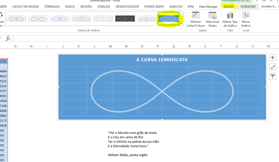 Com um pouco de formatação, chegamos à curva Lemniscata, com fórmulas e gráficos de Excel.