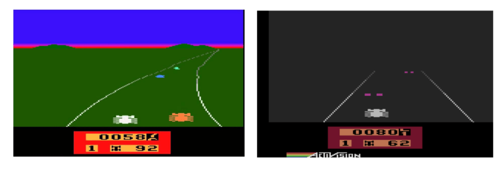 É da mesma época o joguinho Enduro, de Atari. Um carro de corrida que deve ultrapassar outros carros. Na fase normal, é mais simples, dá para ver os demais carros à distância. Contudo, há uma fase em que surge uma neblina espessa, e só dá para ver os outros carros a uma curtíssima distância.