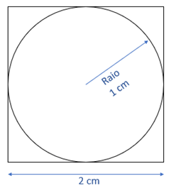 Imagine um círculo de raio 1, que tem área pi*r^2. Este círculo, inscrito num quadrado de lado 2 (área 4).