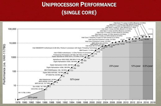 A Lei de Moore diz que o poder computacional dobra a cada 18 meses a um custo constante. Nas últimas décadas, foi esse ganho de eficiência que permitiu o avanço computacional exponencial que vivenciamos. A Lei de Moore traduz uma predição, um comportamento, não é uma lei física.