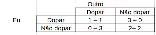 Quem se dopar leva enorme vantagem, e certamente vencerá. Se eu me dopar e o outro não o fizer, venço. Se eu não me dopar e o outro o fizer, perco.