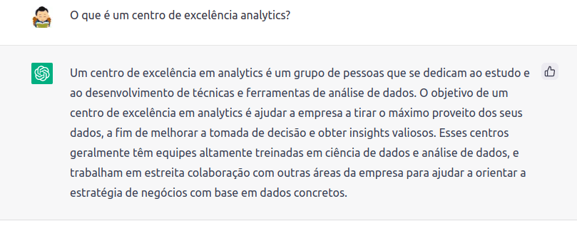 Um centro de excelência em analytics é um grupo de pessoas que se dedicam ao estudo e ao desenvolvimento de técnicas e ferramentas de análise de dados. O objetivo de um centro de excelência em analytics é ajudar a empresa a tirar o máximo proveito dos seus dados, a fim de melhorar a tomada de decisão e obter insights valiosos. Esses centros geralmente têm equipes altamente treinadas em ciência de dados e análise de dados, e trabalham em estreita colaboração com outras áreas da empresa para ajudar a orientar a estratégia de negócios com base em dados concretos.