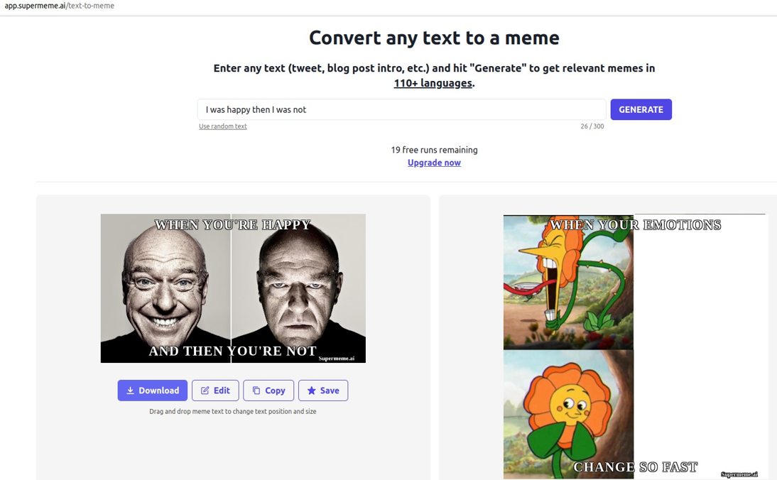 Teste: escrevi “I was happy then I was not”, e retornou a imagem abaixo.