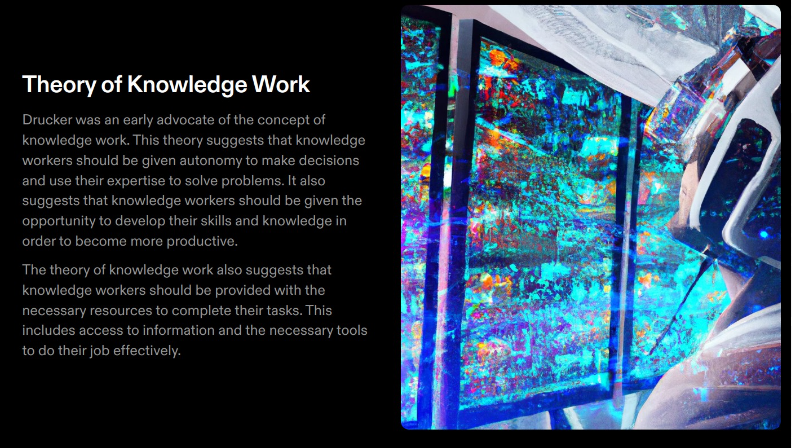 Testei com o tema “Peter Drucker”. Veio uma estrutura de apresentação, alguns tópicos e imagens.