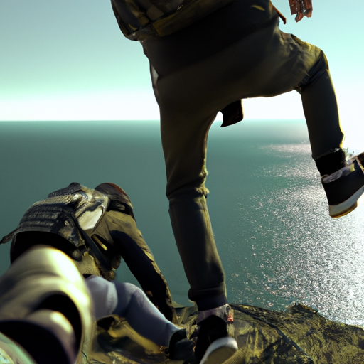Ilustração gerada pelo Dall-E, com o seguinte prompt: “man kicking a traveller in the top of a mountain towards the sea. cyberpunk style. Highly detailed, 4k.”