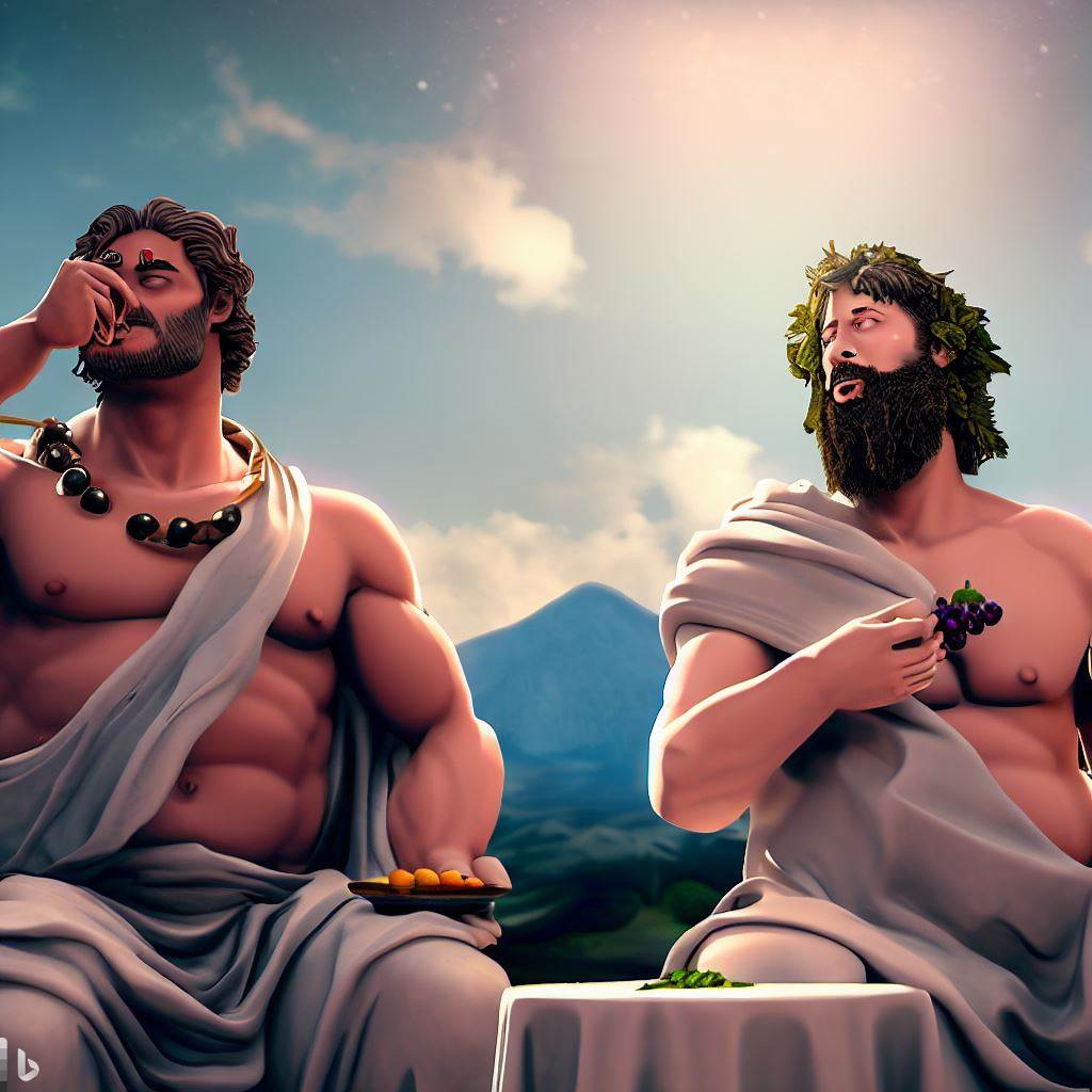 Prompt = “Handsome heroic tall greek god apollo staring at the sky and fat short ugly greek god Dionysus eating grapes and drinking wine. background mountains of ancient greece. hyper realist, full of details, 4k.”