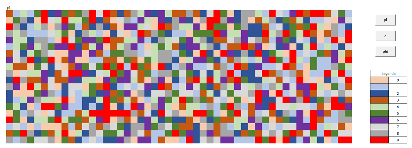 Que tal visualizar o número pi? Uma forma de fazer é transformar o número num código de cores. Por exemplo, pi = 3,1415… Se o 3 for um marrom, o 1 o azul, etc, temos um gráfico como o seguinte, com mil dígitos. É relativamente fácil fazer esse diagrama no Excel. Basta colocar os números … Continuar lendo Visualizando números com cores