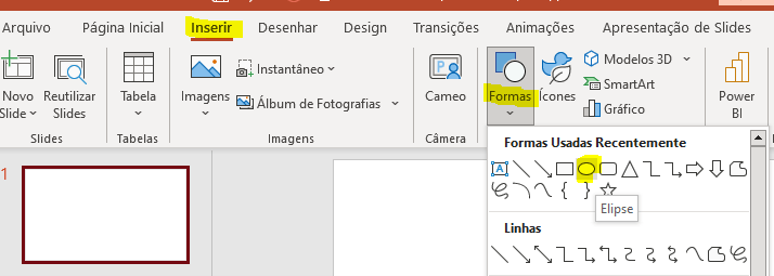 No Power Point, Inserir -> Formas -> Elipse, para inserir um shape no slide.