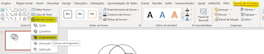 Felizmente, é possível. Selecionar as formas a serem transformadas e ir em Forma de Formato -> Mesclar Formas -> Fragmentação.