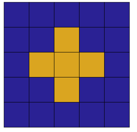var n2 = [[1, 0, 1, 0, 1], [1, 0, 1, 0, 1], [0, 0, 0, 0, 0], [1, 0, 1, 0, 1], [1, 0, 1, 0, 1]];