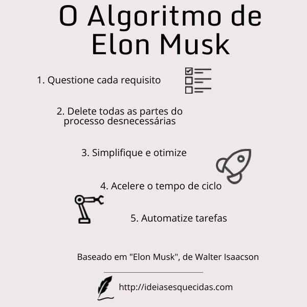 Vale a pena entender o “algoritmo” que ele criou em 2017, quando a Tesla tinha a missão de produzir 5000 sedans por semana do Model 3 – a fim de manter a empresa viva.