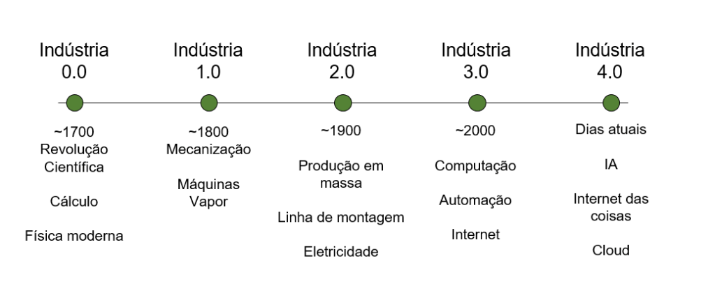 É comumente citado que a Indústria 1.0 foi a revolução da mecanização e vapor, por volta de 1800. A 2.0 foi o domínio da eletricidade, meados de 1900. A 3.0, a computação e internet, meados de 2000. E a 4.0 inclui a AI, cloud, IOT, nos tempos atuais.